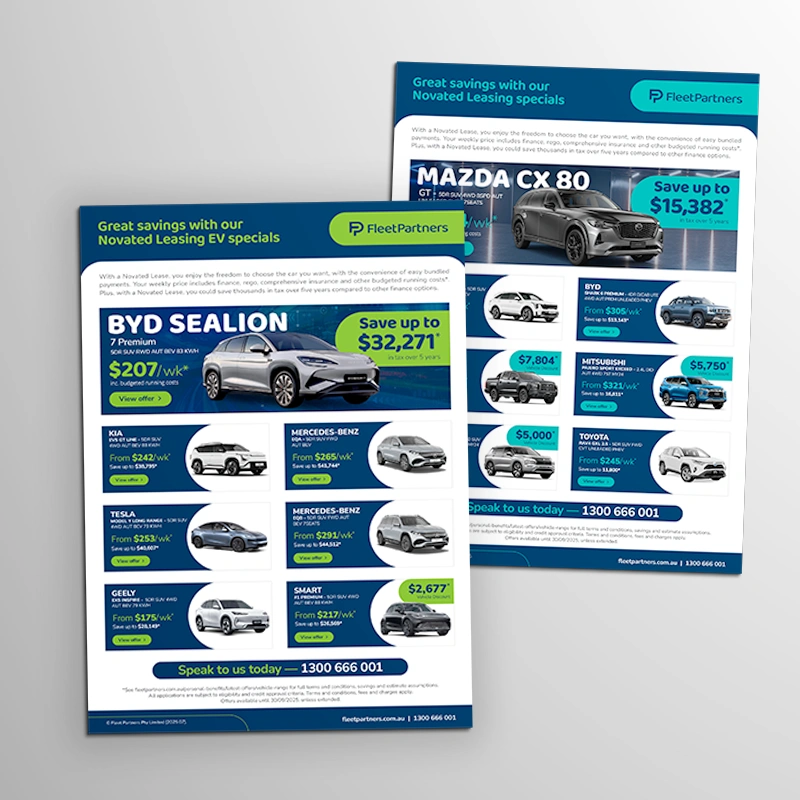 As Marketing Design and Campaign Manager at FleetPartners, I looked after the creation and rollout of branded assets and campaigns for all sorts of marketing material. The job was a real mix of design work, project management, and stakeholder collaboration. Launching campaigns like their quarterly promotions, paid digital and social campaigns. Producing work with a mix of media from motion video, gif animation, paid digital campaign builds, event logos, corporate reports and vechile graphic wraps .