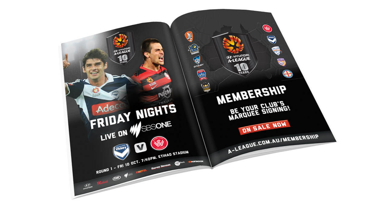 To celebrate the Hyundai A-Leagues 10th season, I created a logo and the brand guidelines for the season. It was present on all designs and creative throughout that season.