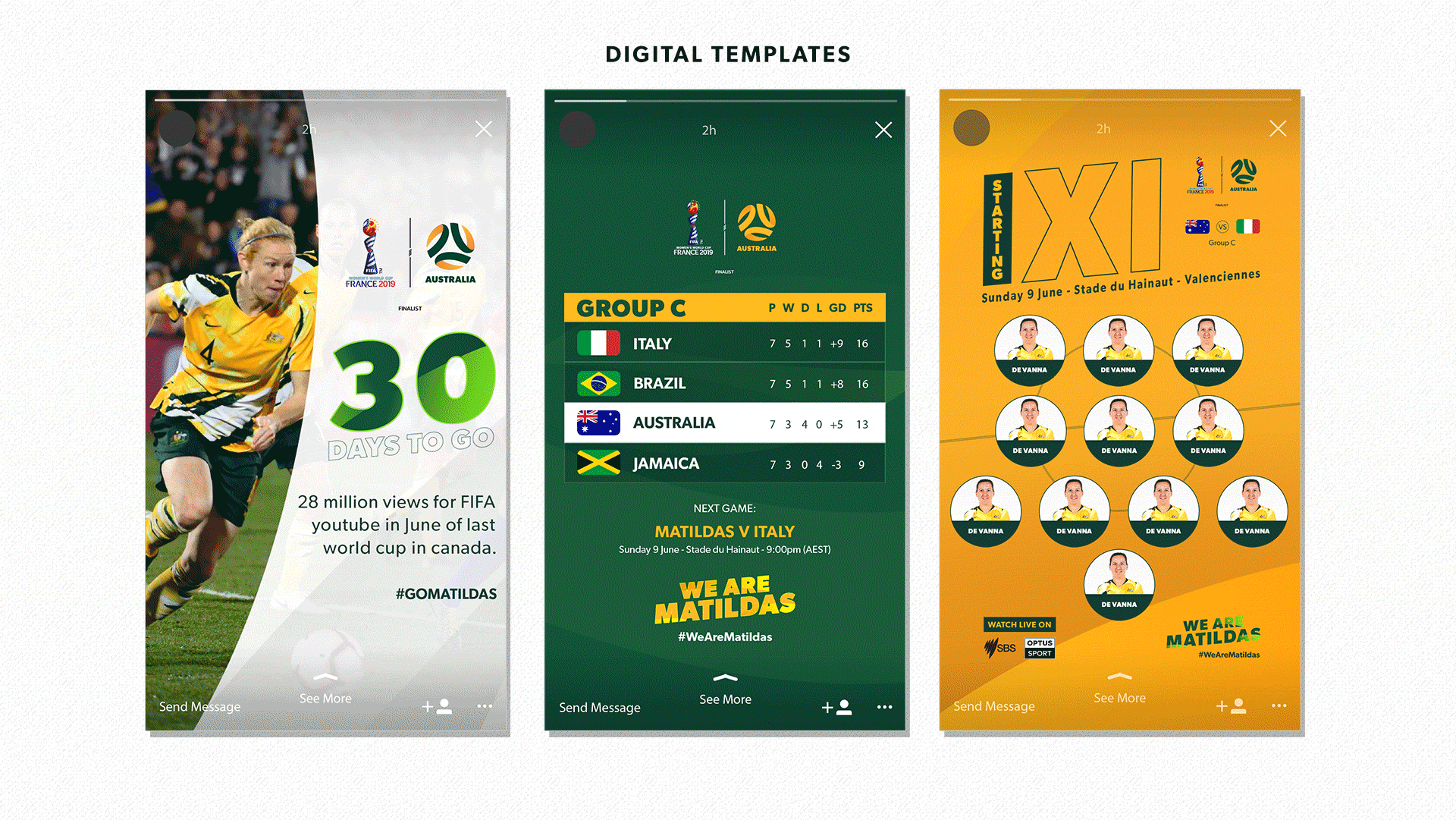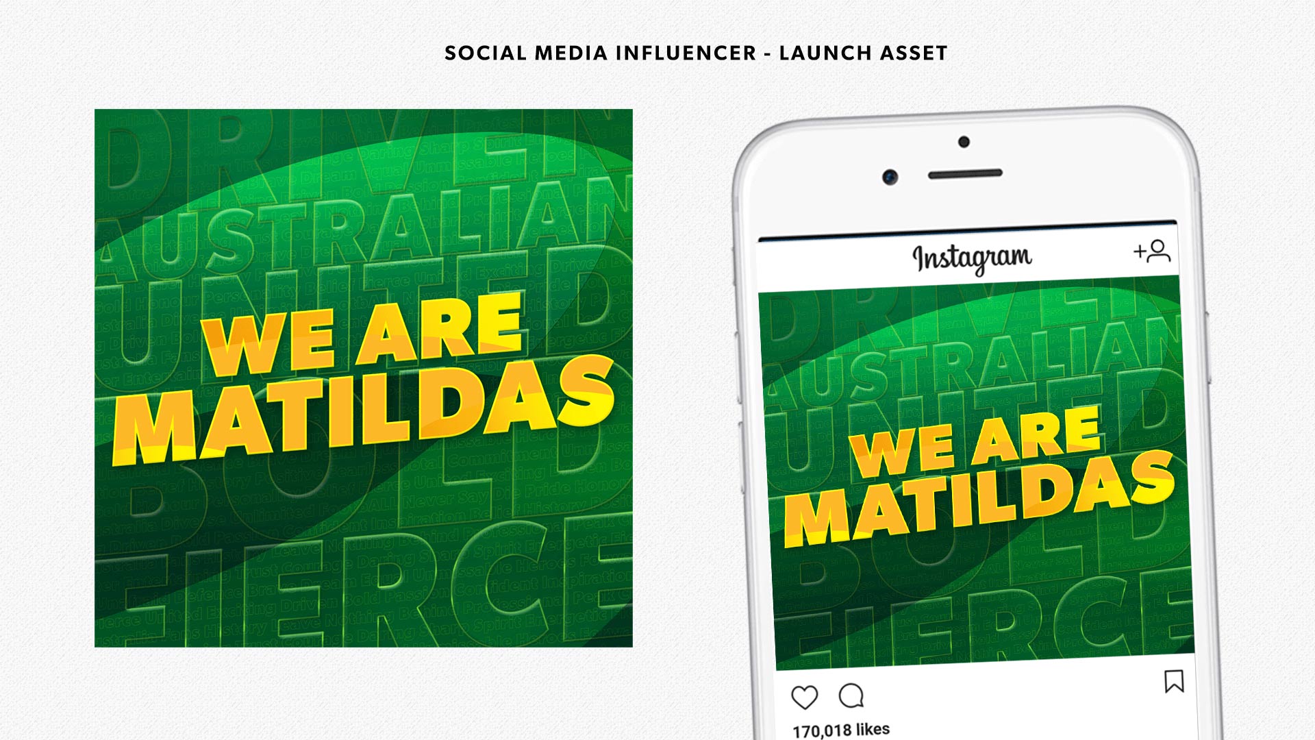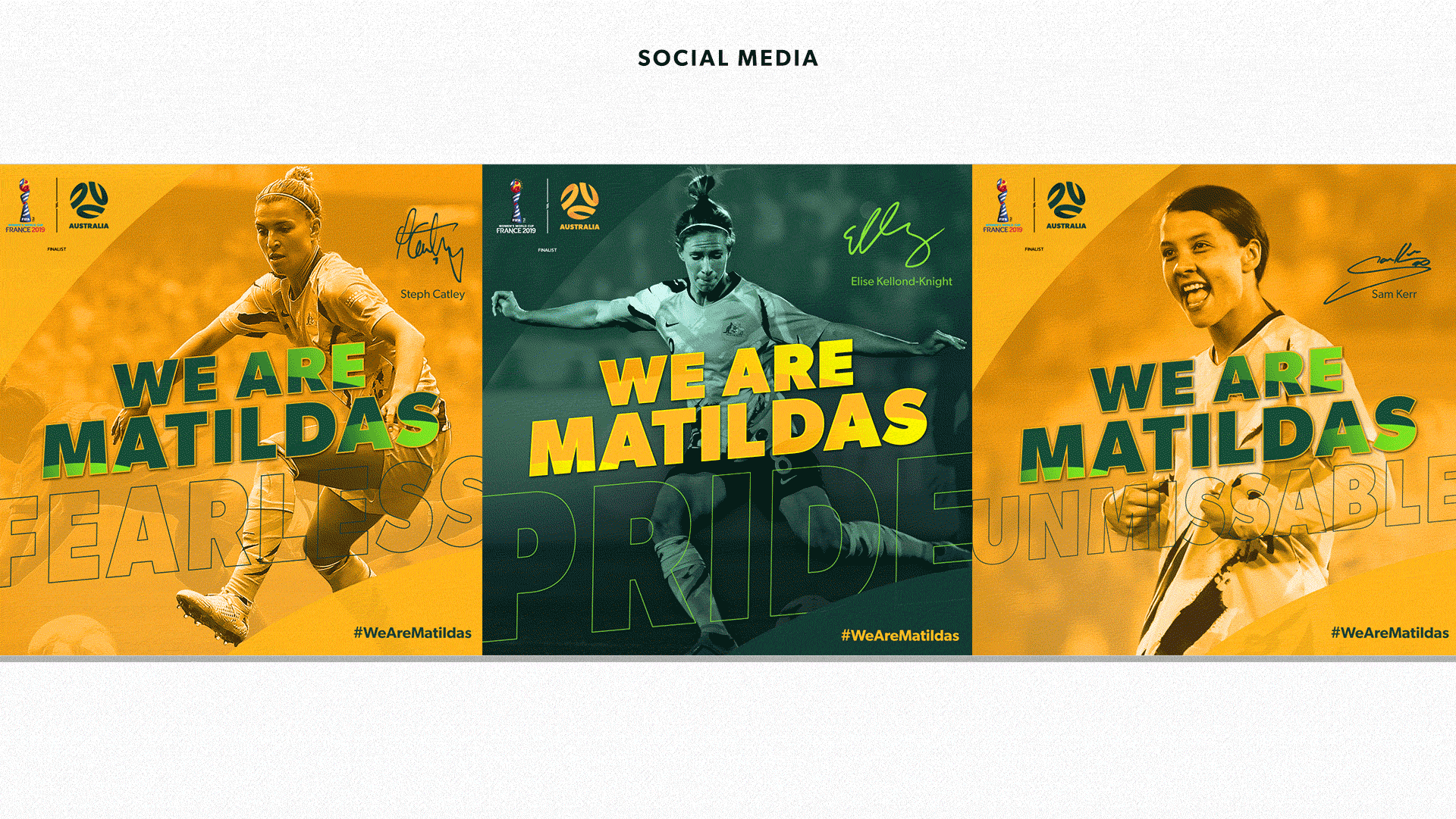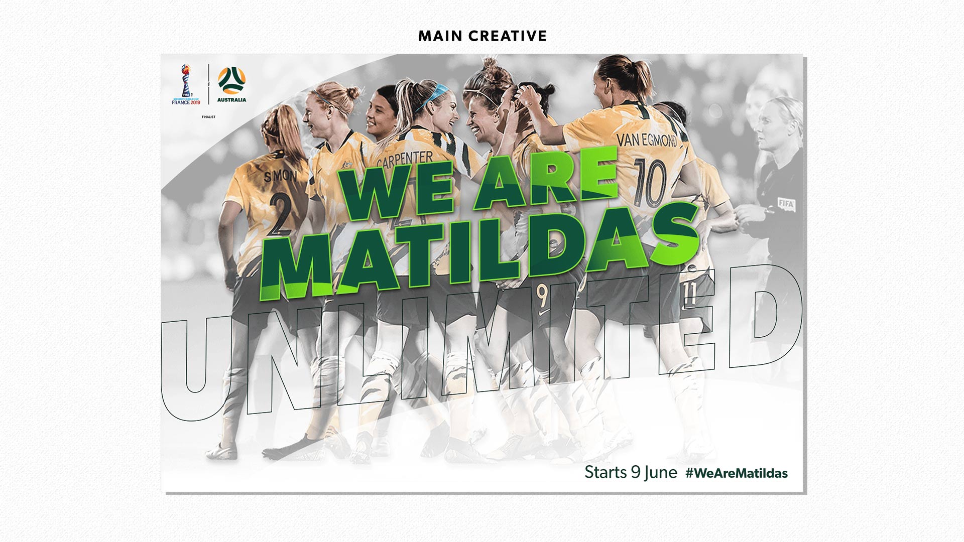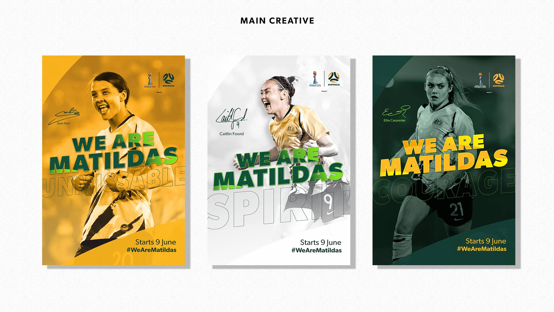 The task was to create a design strategy for the Australian Women's Football Team "The Matildas" for the FIFA Women's World Cup France 2019 football tournament. I implemented the creative campaign which advocated the "We Are Mailtdas" marketing message. Adopting the brand values and list of key words for the brand. I created a logotype, the visual design look and feel. This was then applied to graphic designs across multiple channels and a wide varitation of assets, such as digital, social and paid advertising. A project I worked on individually from conception through to finished art. Examples of this work can be viewed above.